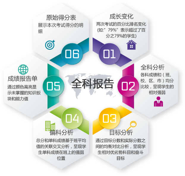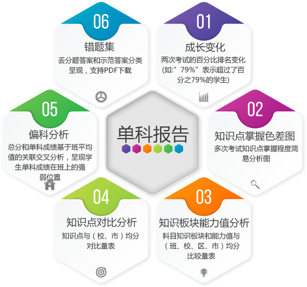 展示市、区、县、班级以及学生的历次考试数据(总分/单科/知识点/能力值)和排名,可横/纵向比较。